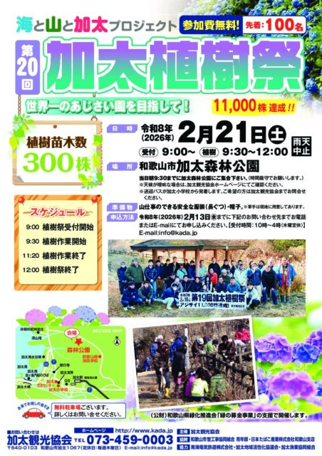 2026年1月16日 お祭り 第20回加太植樹祭 一緒にあじさいの植樹をしましょう! 【日時】令和8年2月21日(土)(植樹)9:30〜12:00 【場所】和歌山市加太森林公園内管理棟(雨天中止) 【準備物】山仕事のできる安全な服装(長ぐつ)・帽子 260221_shokujyu20